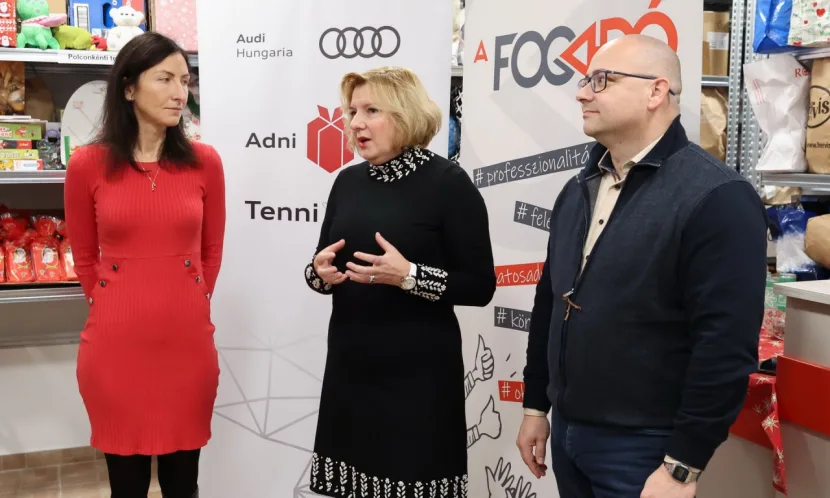 Németh Kinga, az Audi Hungaria személyügyért és szervezetért felelős igazgatósági tagja Nagy Györggyel, az Audi Hungaria Üzemi Tanácsának elnökével közösen nyújtották át az Audi Hungaria munkatársai által gyűjtött ajándékcsomagokat a győri központosított adománycentrum, a Fogadó számára.